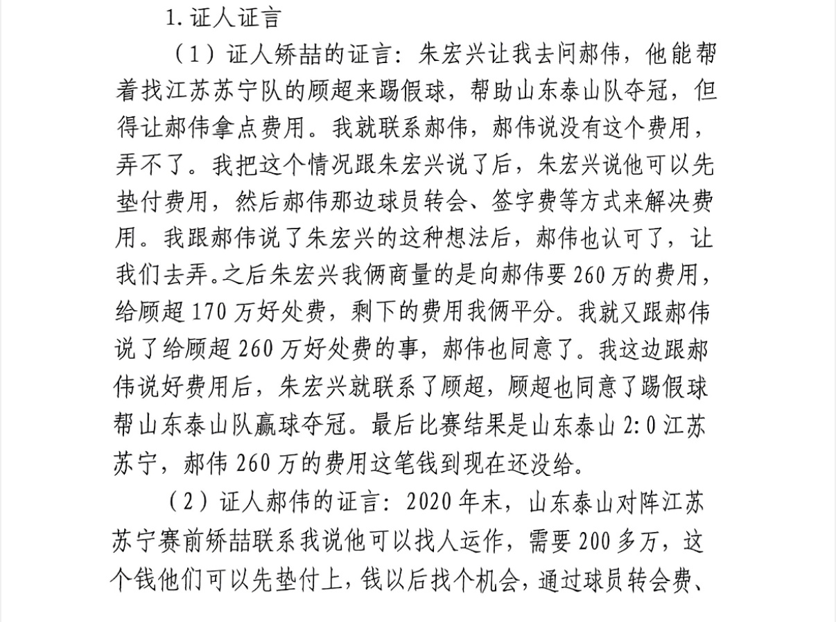 郝伟的证言:2020年末,山东泰山对阵江苏苏宁赛前矫喆联系我说他可以找人运作,需要200多万,这个钱他们可以先垫付上,钱以后找个机会,通过球员转会费、签字费把钱赚回来,我同意了,矫喆就去做江苏球员“工作”,加上我这边让球员全力以赴去踢,最终这场比赛的比分是山东泰山队2:0江苏苏宁,我们夺冠了。矫喆和我说他们运作这场球花了200万,这个钱是矫喆他们出的。我没有主动还过这个钱,但是我把矫喆招到我们队当助理教练了,给他找了个工作,也算是还他帮我的运作这场比赛的人情了。