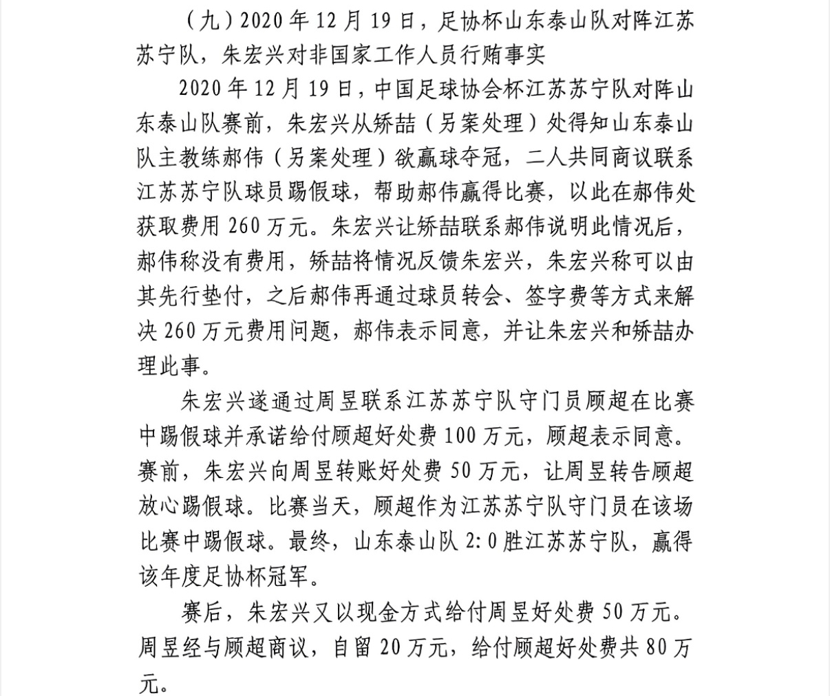 顾超的证言:比赛前几天周昱跟我说,朱宏兴跟他说山东泰山想拿足协杯冠军,希望我配合一下,还说对方给100万,我同意了。这场比赛我没有正常发挥,该出击的时候没出击,给了对方很多次机会,最后的结果对方2:0赢了。我得到了80万元好处费,给周昱20万元。