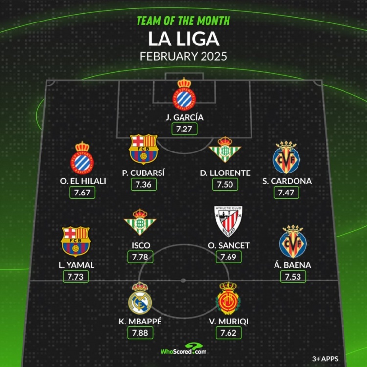 2025-03-02 22:01:22whoscored西甲2月最佳阵:姆巴佩、亚马尔领衔,伊斯科在列