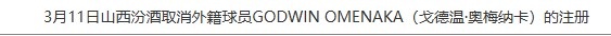 2025-03-11 23:00:03山西男篮取消戈德温-奥梅纳卡的注册 并为凯西-普拉瑟完成注册